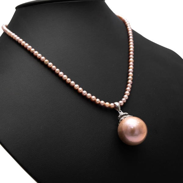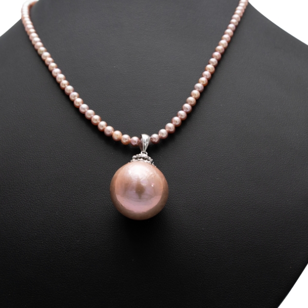 大粒の直径約18mm、存在感抜群の有核淡水パールネックレスです。